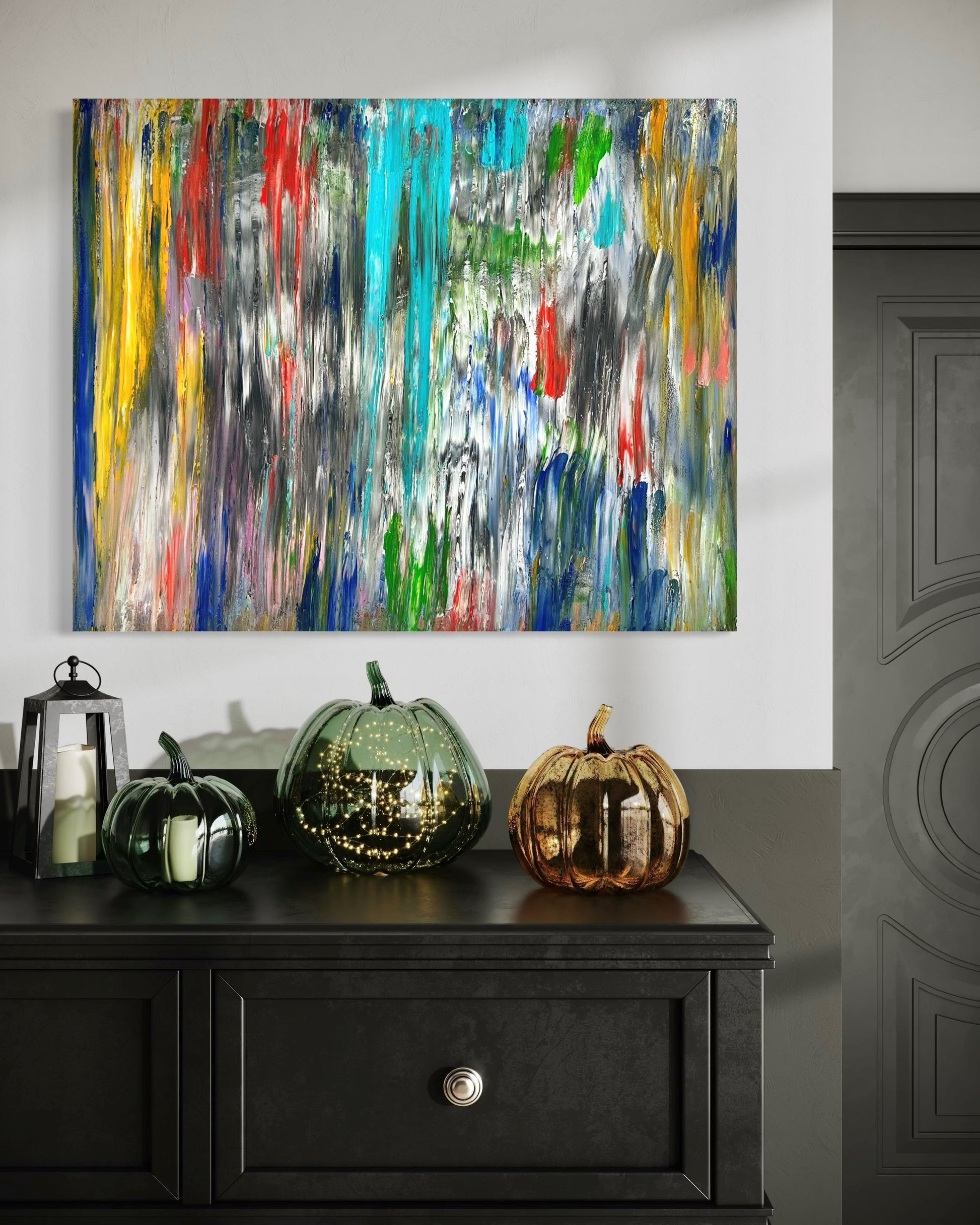 ‘Verve’ is a captivating modern painting that contrasts dark, moody tones with bursts of vibrant color. Its dynamic composition evokes energy and depth, creating a bold, striking visual impact.