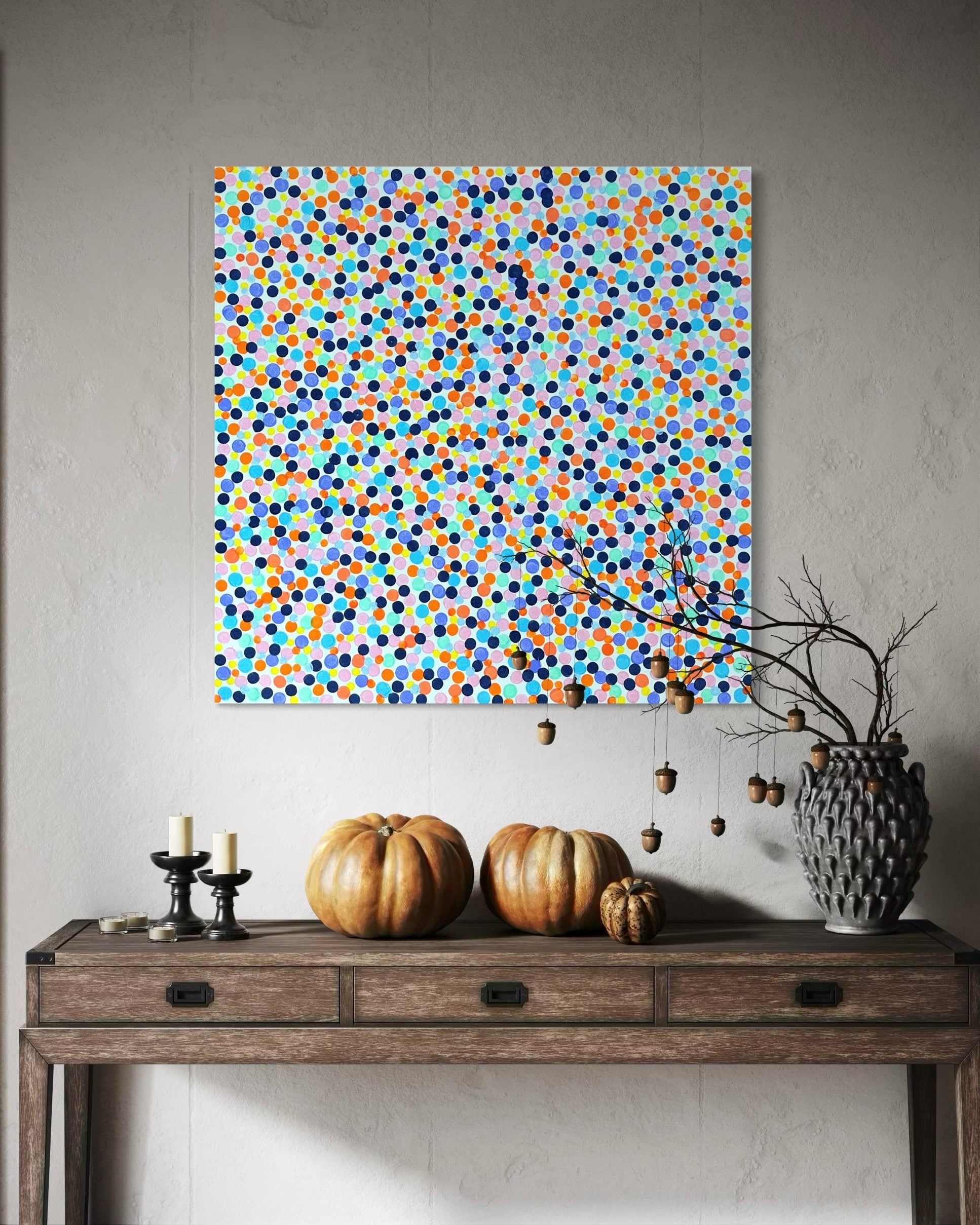 ‘Gumball’ is a delightful explosion of colour, brimming with playful energy. Bright, cheerful hues dance across the canvas, capturing a sense of childlike wonder and fun, reminiscent of a candy-filled dream.