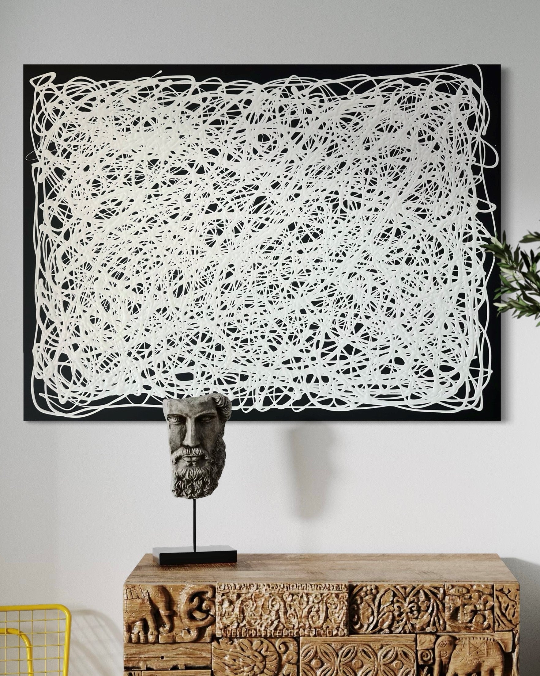 ‘WhiteStorm’ captivates with its dynamic white swirls set against a bold black background. This striking contrast creates a powerful visual impact, commanding attention and adding dramatic flair to any space. This dynamic piece evokes magic, mystery, and a touch of enchantment.